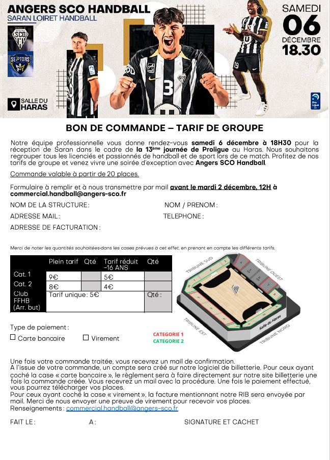 L’équipe professionnelle d’Angers SCO Handball vous donne rendez-vous pour l’un de ses ultimes combats en 2025 ; la réception de Saran à la Salle du Haras, Samedi 6 Décembre à 18H30.