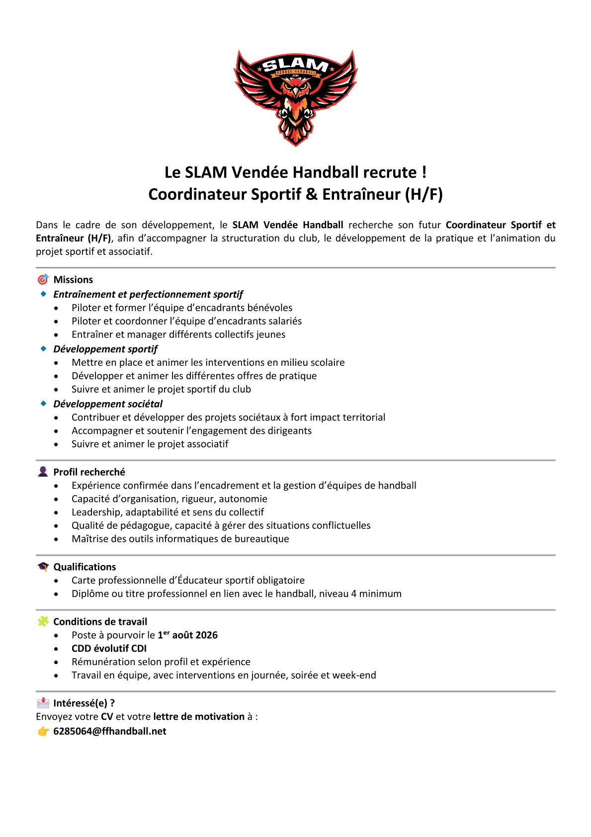 Dans le cadre de son développement, le SLAM Vendée Handball recherche son futur Coordinateur Sportif et Entraîneur (H/F), afin d’accompagner la structuration du club, le développement de la pratique et l’animation du projet sportif et associatif.